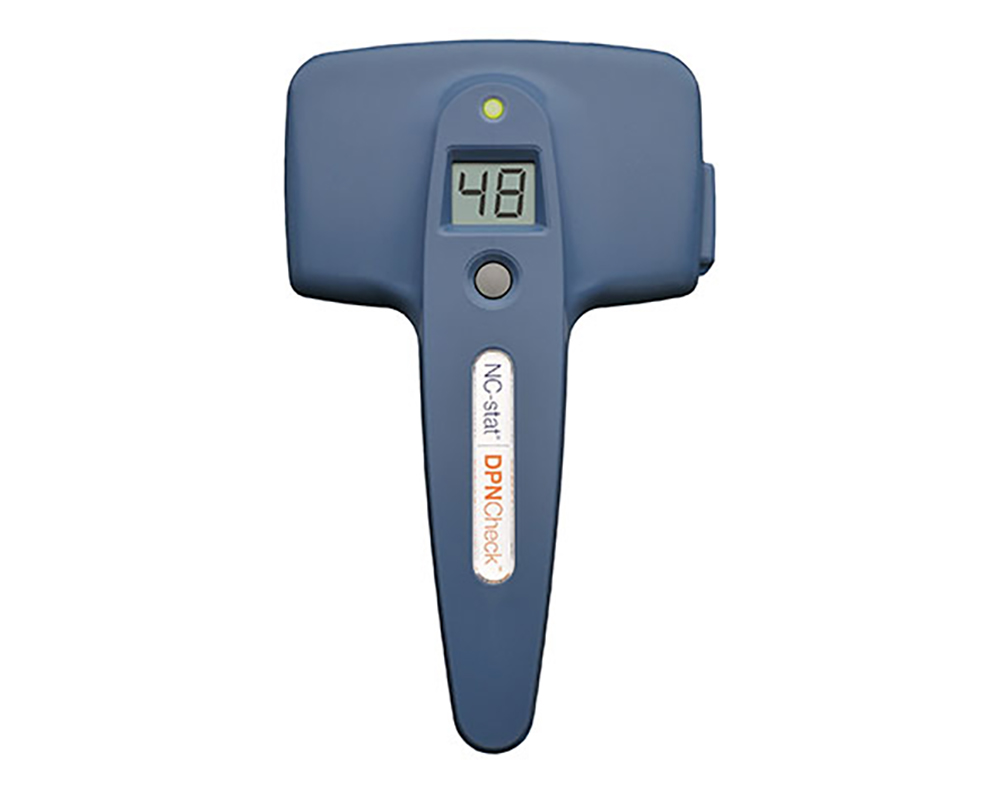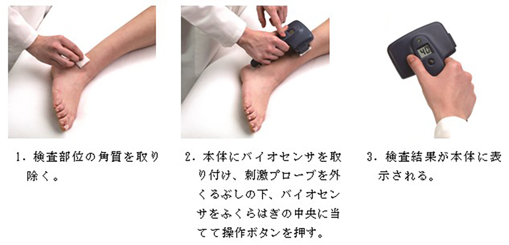 糖尿病治療の目的は合併症の予防と改善です。糖尿病の合併症には、大きく分けて「最小血管障害」と「大血管障害」とに分類されます。最小血管障害には糖尿病腎症、糖尿病網膜症、糖尿病末梢神経障害があります。糖尿病腎症の状態把握と治療のために定期的な尿の検査や採血検査を行います。糖尿病網膜症には当院には眼科専門医も在籍しておりますので眼科検査を定期的に受けていただきます。糖尿病性神経障害は診察室にて適切に診断をさせていただきます。大血管障害には心筋梗塞、脳梗塞、閉塞性動脈硬化症があります。これらの合併症の主原因は動脈硬化です。動脈硬化は糖尿病以外にも高血圧や脂質異常症や喫煙が関係します。このため糖尿病の治療以外の疾患も含めた総合的な管理が大切になります。大血管障害の病態把握のための動脈硬化の評価には頸動脈エコーや脈波(ABI/CAVI)を行っております。糖尿病性末梢神経障害の評価は、神経伝達検査装置を用いて評価します。この装置は末梢の感覚神経の一つである腓腹(ひふく)神経に電気刺激を与え、神経に興奮が伝わる速度(神経伝導速度)と大きさ(活動電位振幅)を測定し評価をすることができる装置です。1回あたり10秒前後で痛みも無く検査をすることができます。